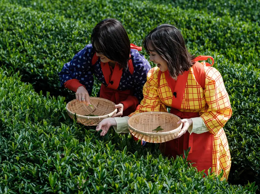 宮野園さんの茶畑で、茶娘衣装に着替えてお茶摘みを体験。自分の手で摘んだ茶葉を手作りでお茶にします。また、通年で実施されている組茶も体験しました。様々な種類の日本茶を組み合わせて、自分好みのお茶を作ります。
