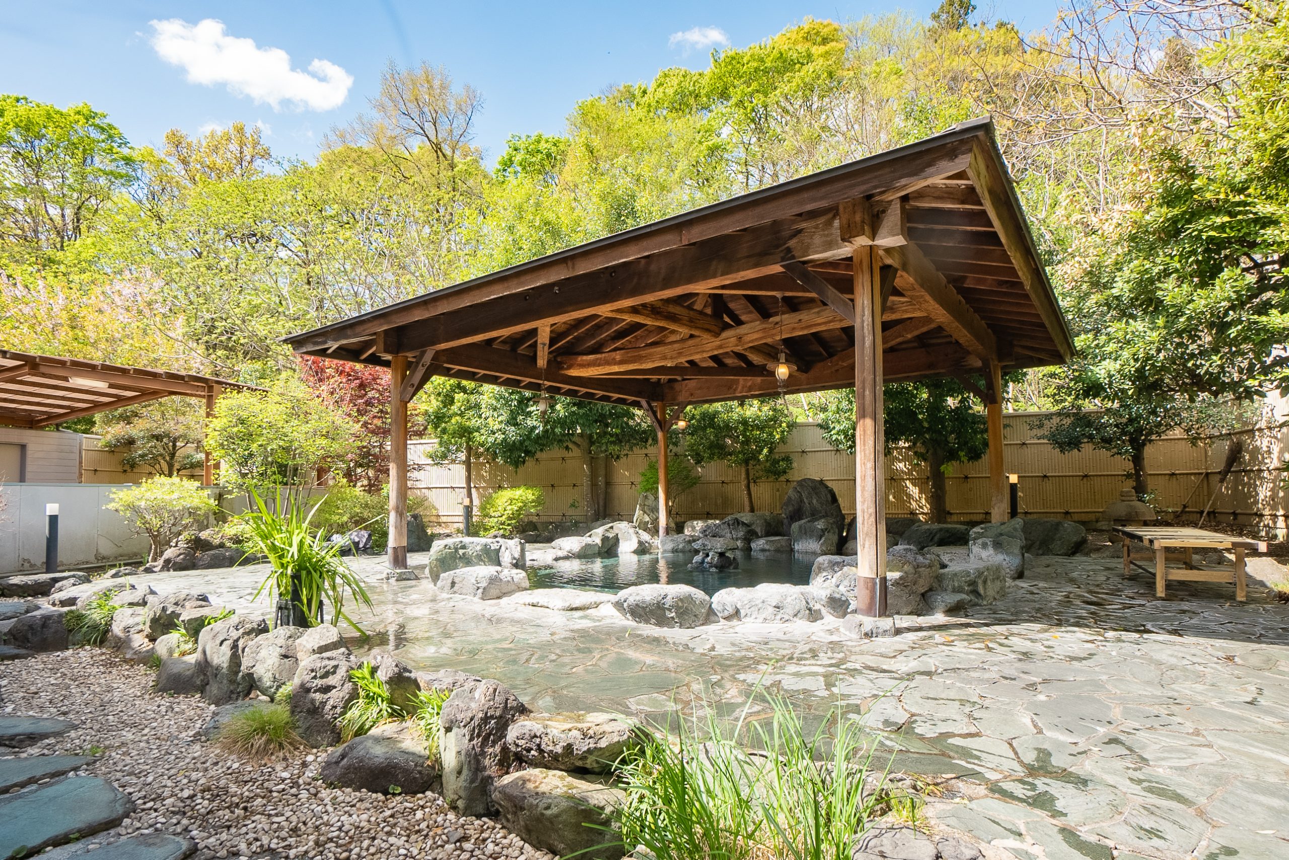 全室が独立した一戸建て離れの温泉宿。開放的な露天風呂で美肌の湯に浸かった後は、地元の食材をふんだんに使った料理を味わえます。